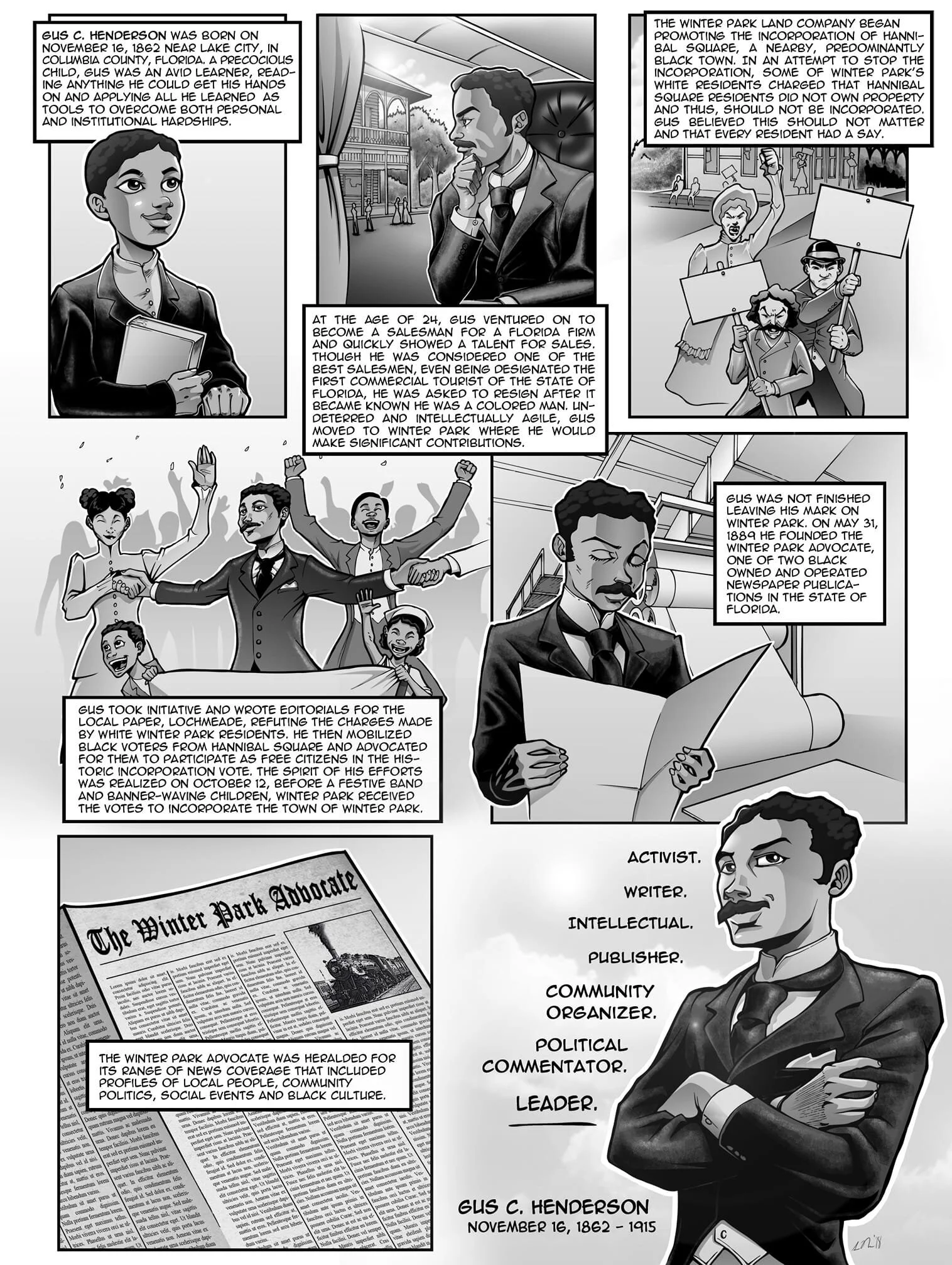 The Gus Henderson bio comics was project that grew out of my work with the Hannibal Square Community Land Trust. The goal was to bring attention to the black history of the historic community. In many ways the historical “fact” on display in the comics are a matter of public record, but this single page brought Henderson to life. The artwork from Selim Nurudeen captured Henderson’s vibrant character. Rather think of him as an outlier, Henderson’s vision matched an African American vision of freedom and prosperity that shaped black communities in the region.