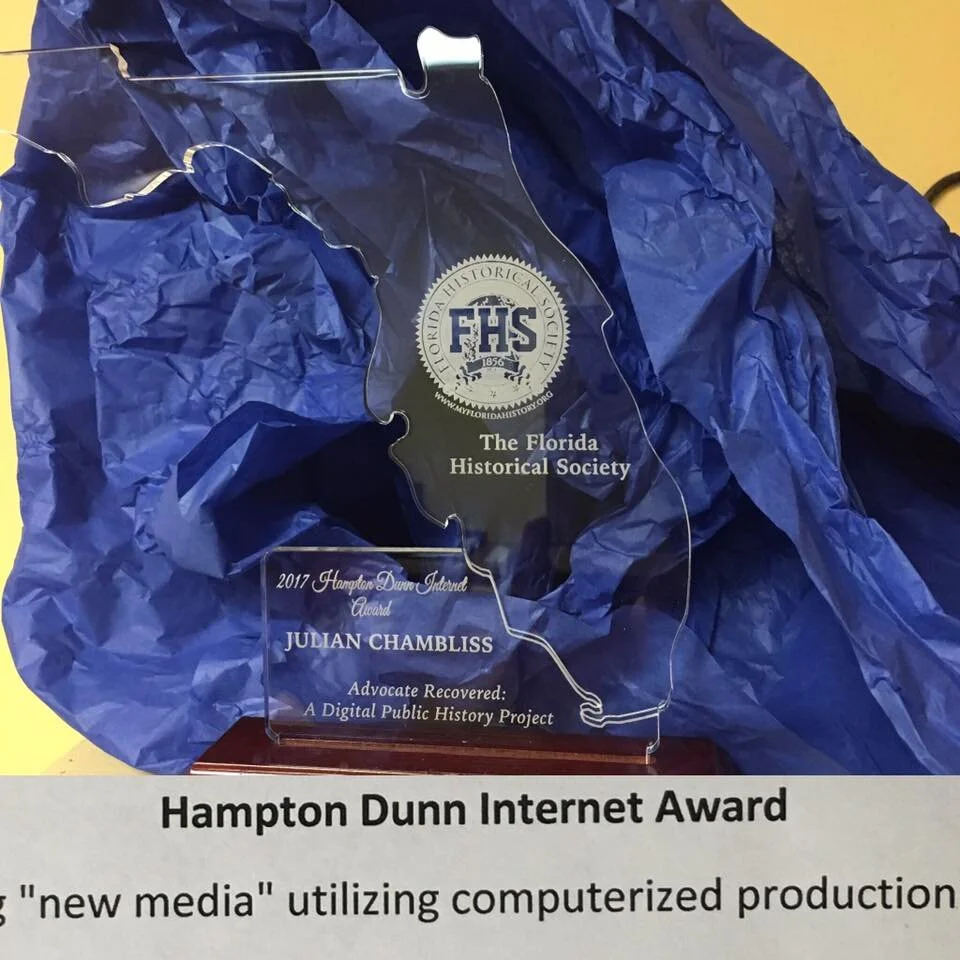 I'm thankful to Ben Brotemarkle and the folks at the Florida Historical Society (FHS) for recognizing my Advocate Recovered (AR) project with Hampton Dunn Internet Award. It is a great honor to be recognized by one of the oldest historical society in the United States for this generative digital history project.