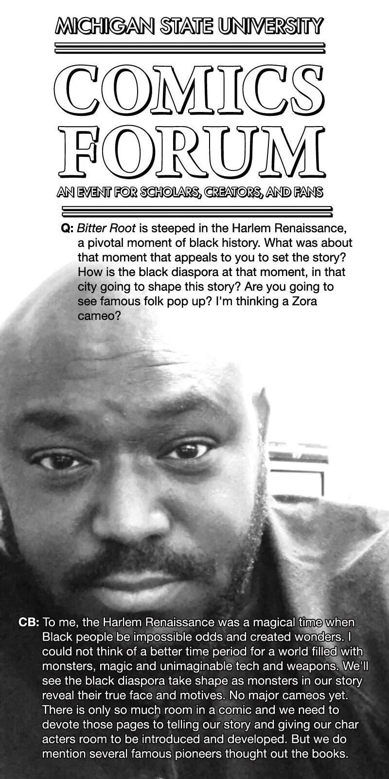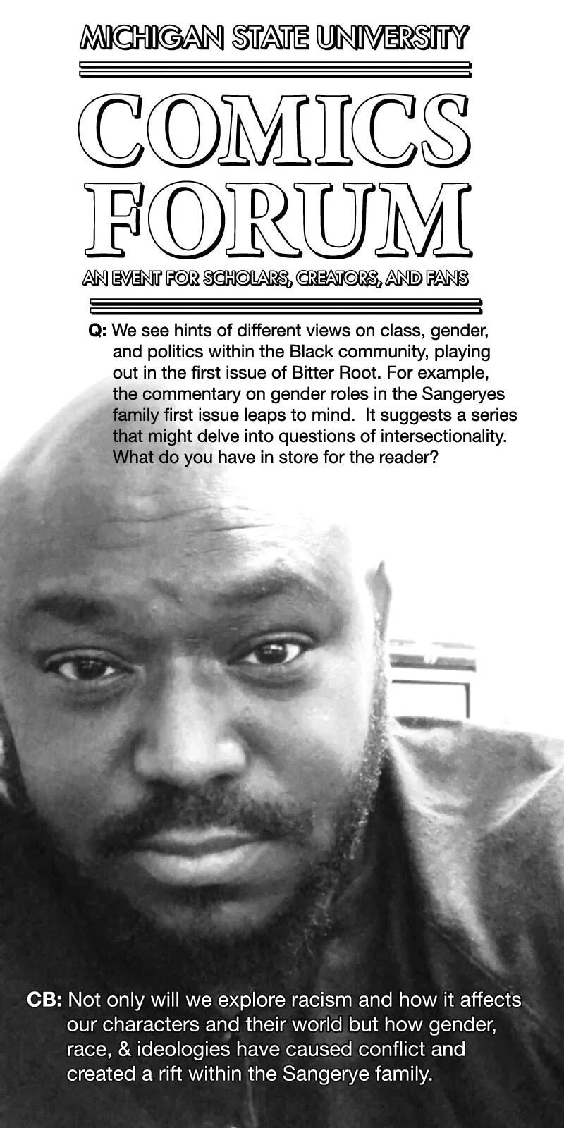 As we get ready for 2019 Comics Forum, I’m mindful that there are so many great voices we want to include. We are growing the event and good things are going to happen. The conversations that we want to support are about expanding the public’s notion of what comics can do in across and number of categories. I’m interested in the intersection. between race and comics. To that end, these quick take conversations are an extension of my Beyond Impossible interviews. A little help from my colleague allowed me to create a pretty cool twitter thread. Check out the posts below.