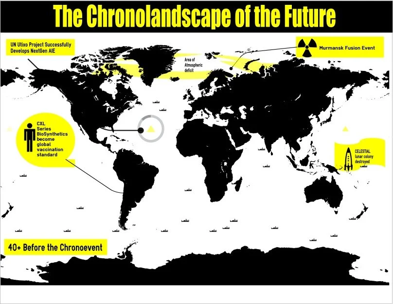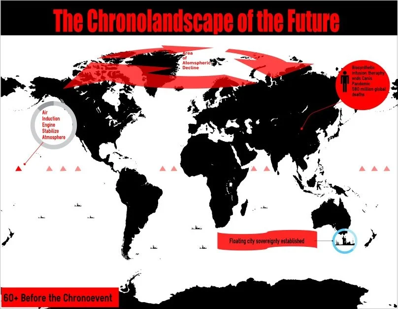 The Chronolandscape of the Future was a series of visual maps showing how environmental damage, asymmetrical warfare, and shifting geopolitical alliances create an uncertain future sixty before the Future Bear arrived in 2012.
