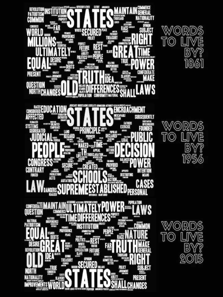 Word Clouds as Art: 'Words to Live By?' demonstrates, perhaps crudely, the importance of southern memory weighed against historical fact. The Cornerstone Speech (1861), Southern Manifesto (1956), and the emails asking for me to be fired for my participation in 13 Flags Event (2015) shared many of the same words. Of course, this is a direct legacy of a past misremembered and symbols that support that false memory.